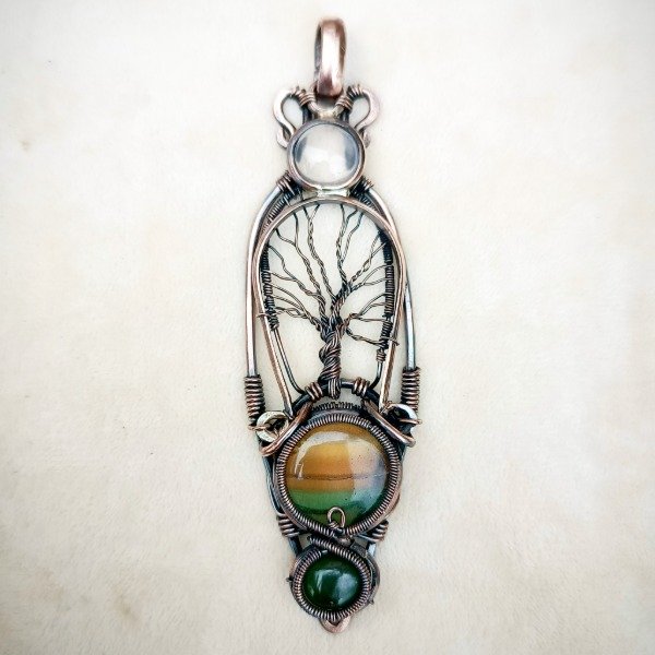 Pieza de cobre con fluorita, ágata y cuarzo rosa.