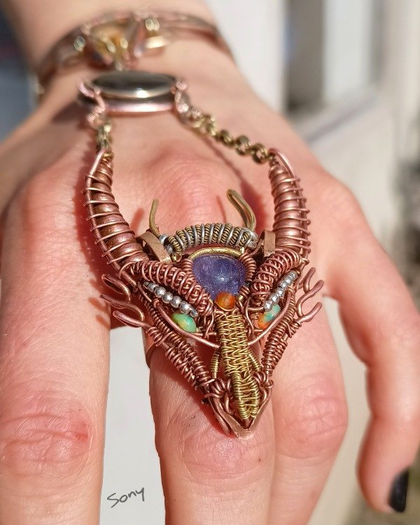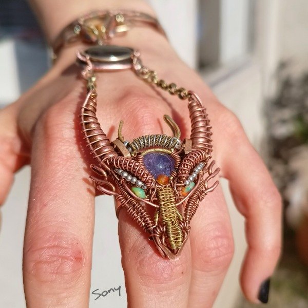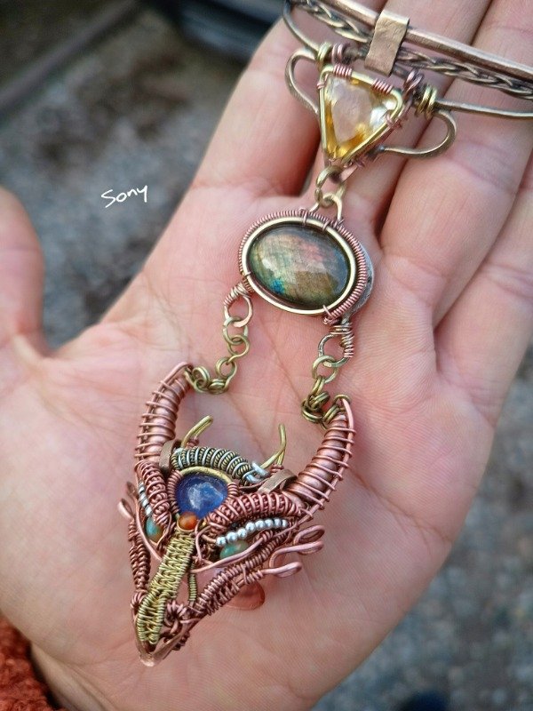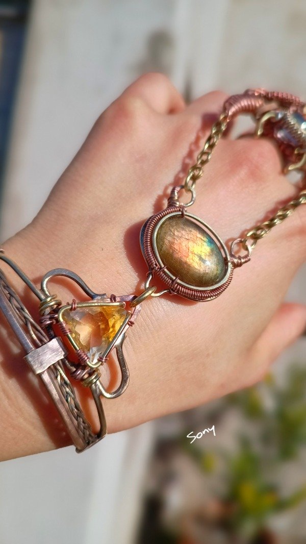 Realizado en cobre y bronce con tanzanita, ópalos, citrino y labradorita.