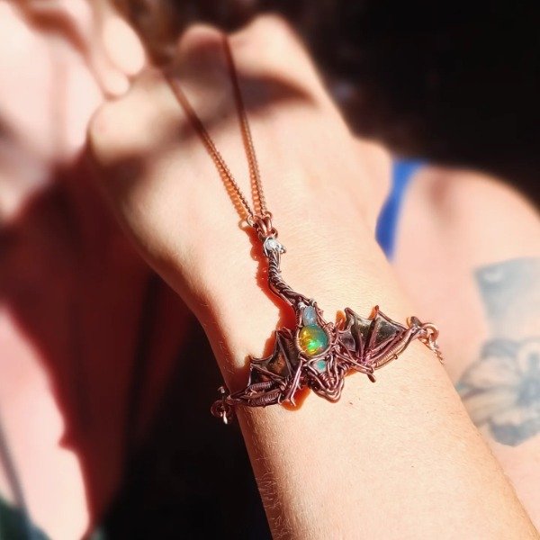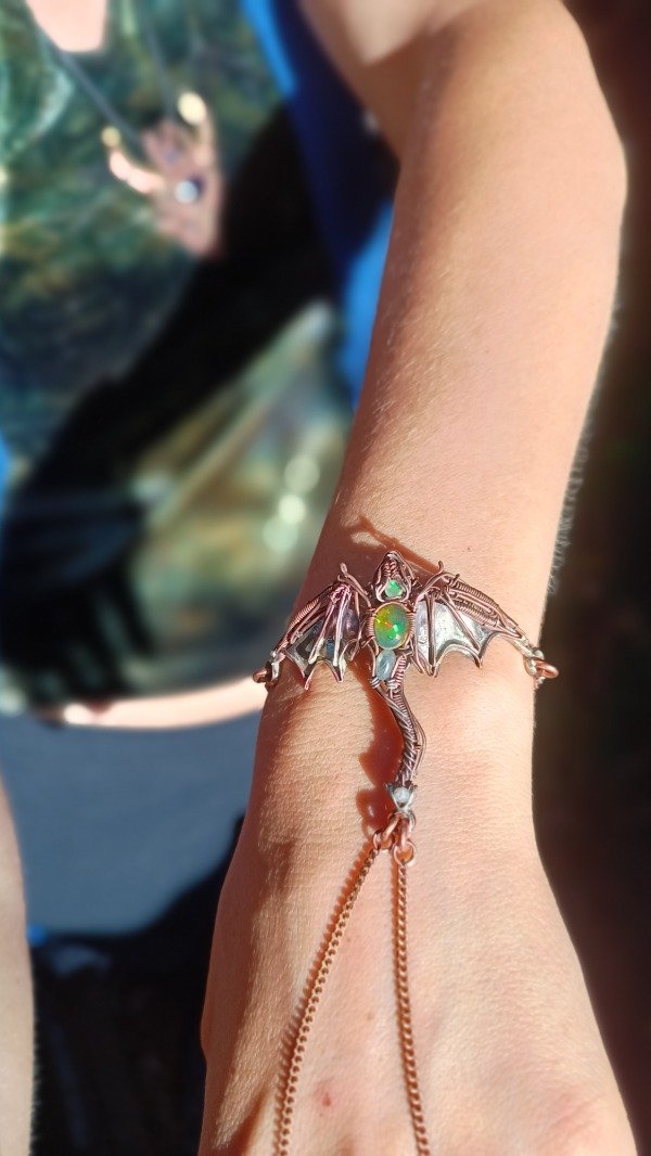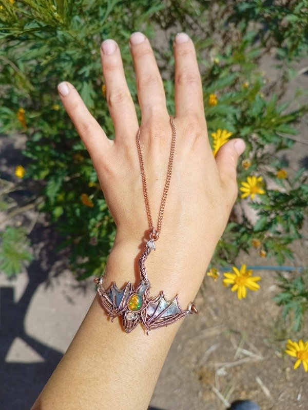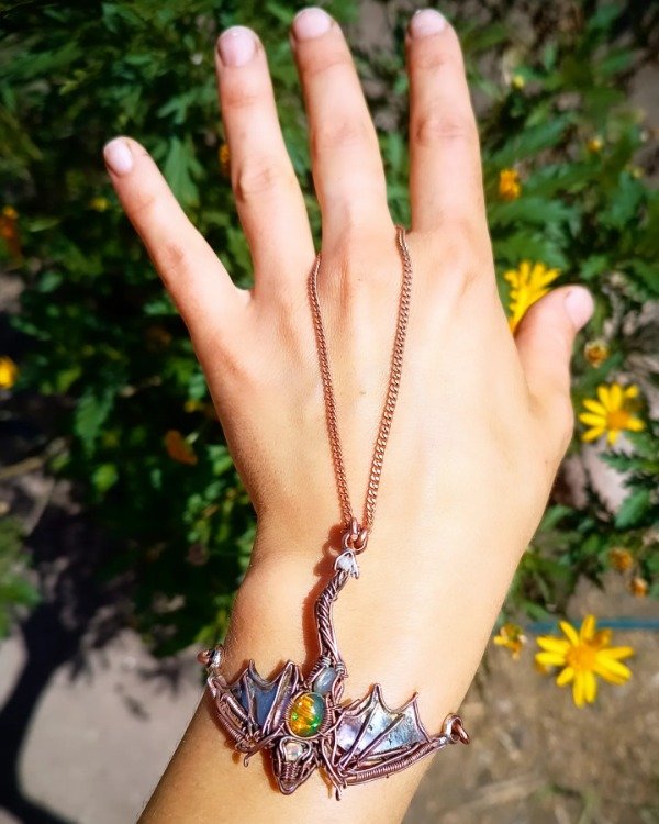 Pulsera anillo de cobre con con detalles en plata. Tiene granate, ópalos.