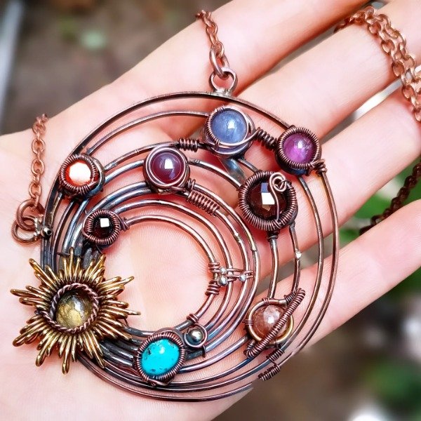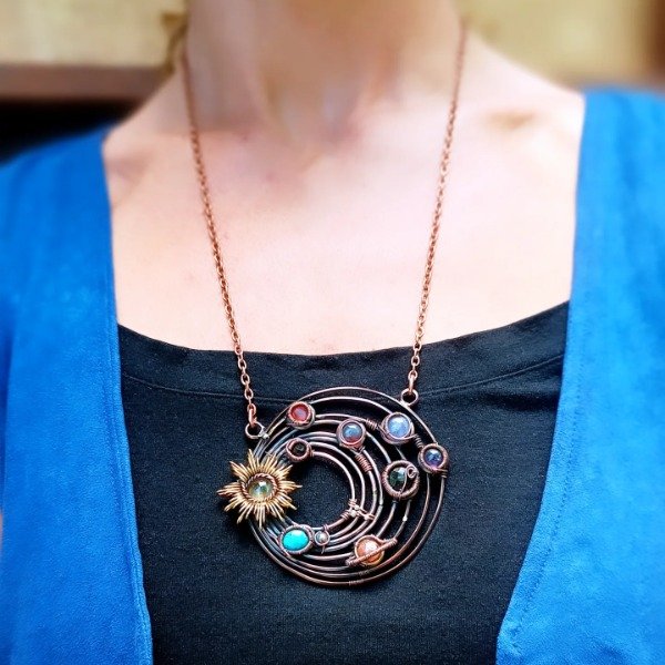 Pieza realizada en cobre con detalles en plata. Tiene citrino, turquesa, ágata cornalina, granate, piedra del sol, tanzanita, cuarzo ahumado y amatista.