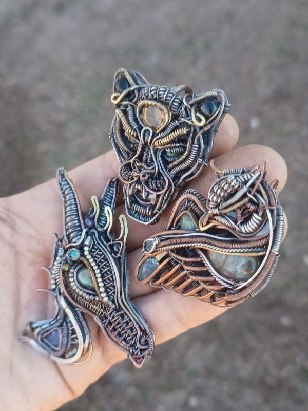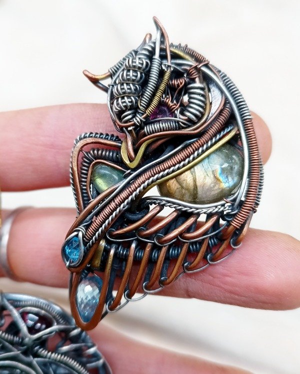 Pieza realizada en cobre con detalles en plata y en bronce. Tiene labradoritas, granate y topacios.