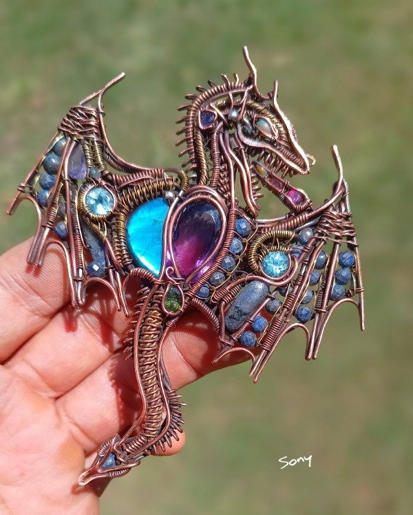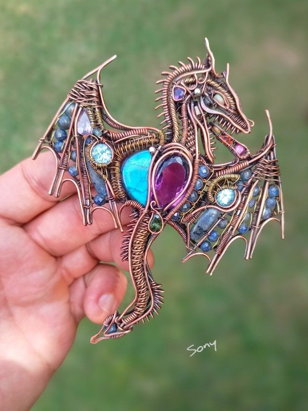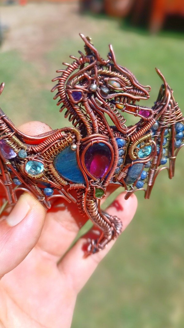 Pieza de cobre con detalles en bronce. Tiene amatistas facetadas/Labradorita/Lapislázuli/Turmalinas verdes/Ópalos etíopes/Granates rojos facetados/Granates mandarín facetados/Topacios facetados/Sodalitas.