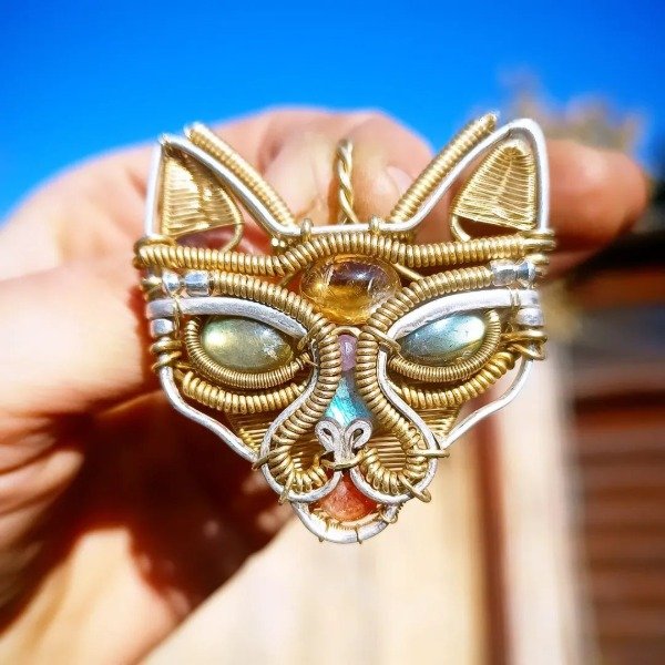 Realizado en plata y bronce con labradorita, citrino y piedra del sol.