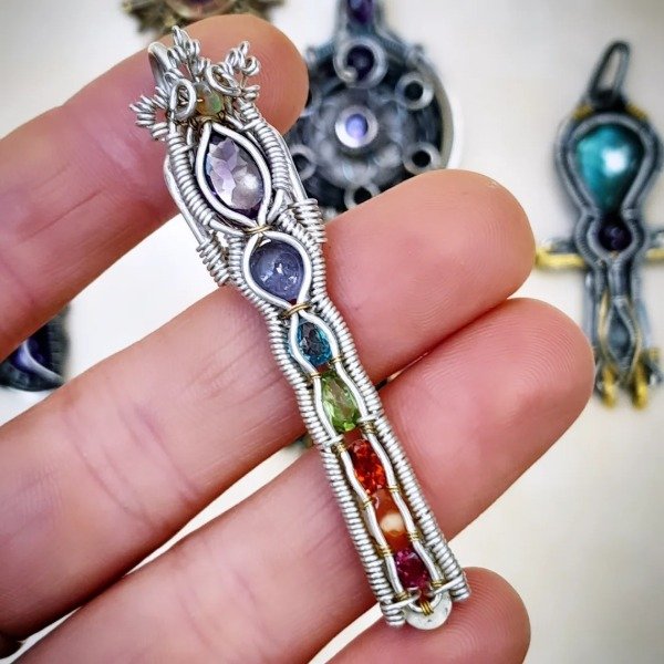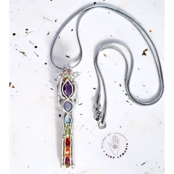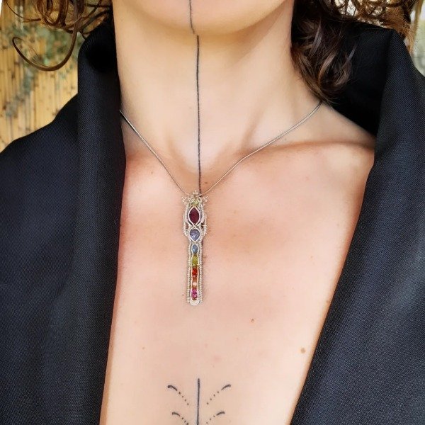 Realizado en plata con detalles en bronce. Tiene opalo, amatista, tanzanita, topacio, peridoto, granate y agata cornalina.