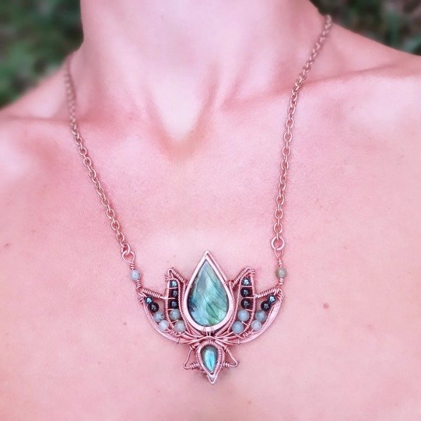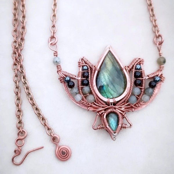 Pieza realizada en cobre con labradorita, cuarzo verde, cuarzo ahumado, fluorita y hematite.