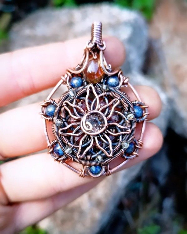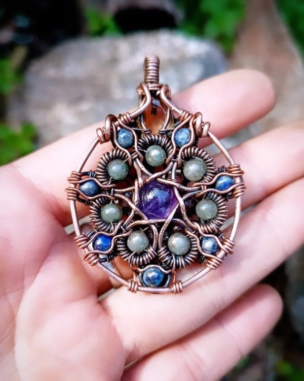 Realizado en cobre con amatista, cuarzo verde, lapizlazuli, granate , citrino y cuarzo ahumado.