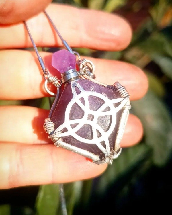 Perfumero mineral de amatista trabajado en plata y acero con labradorita.