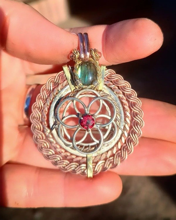 Realizado en plata, bronce y cobre con granate y labradorita. Tiene un sistema movible.