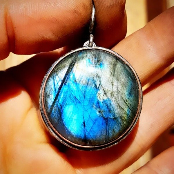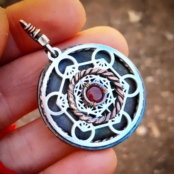 Realizado en cobre con acero y plata. Tiene labradorita y agata cornalina.